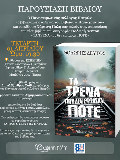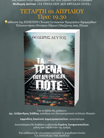 Ο Πανηπειρωτικός σύλλογος Πατρών, το βιβλιοπωλείο ''Γωνιά του βιβλίου - Παπαχρίστου'' και οι εκδόσεις Χάρτινη Πόλη καλούν το κοινό στην παρουσίαση του νέου βιβλίου του Ηπειρώτη στην καταγωγή, συγγραφέα Θοδωρή Δεύτου με τίτλο: ''Τα τρένα που δεν έφτασαν ποτέ'' που είναι βασισμένο σε αληθινή ιστορία. Η εκδήλωση θα πραγματοποιηθεί την Τετάρτη 1η Απριλίου 2026 & ώρα 19:30 στην Αίθουσα της ΕΣΗΕΠΗΝ (Ένωση Συντακτών Ημερησίων Εφημερίδων Πελοποννήσου-Ηπείρου- Νήσων) στην οδό Μαιζώνος 200 στην Πάτρα.
