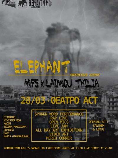 Το θέατρο act στις σκάλες Γεροκωστοπούλου στην Πάτρα φιλοξενεί ένα ξεχωριστό all day event το Σάββατο 28/3/2026. Θα γίνει παρουσίαση του δίσκου "ELEPHANT" με εικαστική έκθεση, installations & video art.