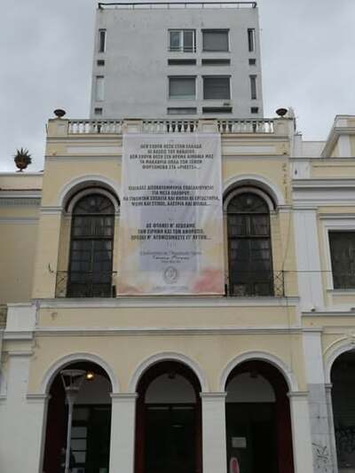 Ένα νέο πανό "ξεφύτρωσε" στο Μέγαρο Λόγου και Τέχνης της Πάτρας, αυτή τη φορά με αντιπολεμικό μήνυμα.