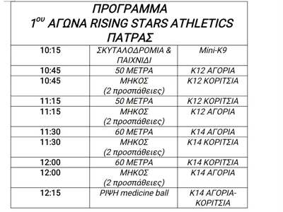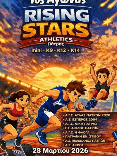 Οκτώ από τα 14 σωματεία της Πάτρας, ΑΓΣ Άτλας 2020, Α.Ε. Εσπερος 2004, Γ.Σ. Αίολος Πατρών, Α.Σ. Νίκη Πάτρας, Α.Γ.Σ. Η Φλόγα, Πατραϊκή ‘Ενωση Στίβου, Α.Σ. Πελεκάνος Πατρών και Α.Σ. Ακρος διοργάνωσας το Σάββατο 28 Μαρτίου τον 1ο Αγώνα RISING STARS ATHLETICS Πάτρας στο Αθλητικό Κέντρο Λαδόπουλου!