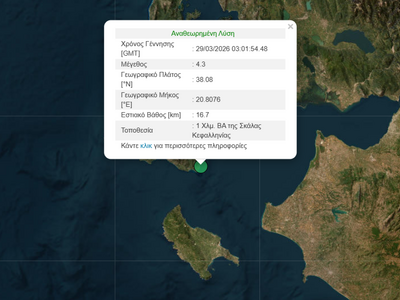 Σεισμός μεγέθους 4,3 Ρίχτερ σημειώθηκε το πρωί της Κυριακής στην Κεφαλονιά.