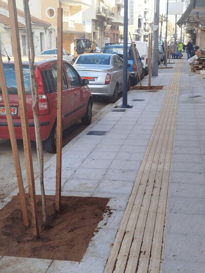 Εργασίες δενδροφύτευσης μετά την ανακατασκευή των πεζοδρομίων στην οδό Σολωμού από τον Δήμο Πατρέων.