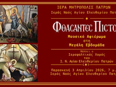 Μουσική εκδήλωση ενόψει της Μεγάλης Εβδομάδος, θα πραγματοποιηθεί την Παρασκευή 3 Απριλίου 2026 στις 19.00 στον Ιερό Ναό του Αγίου Ελευθερίου, στη νέα Εθνική Οδό Πατρών Αθηνών μετά την Αρέθα.