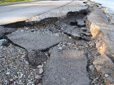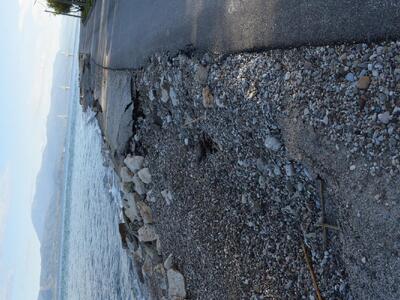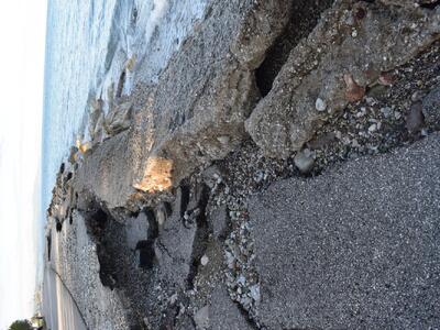 Στις πρόσφατες φωτογραφίες μας με λύπη βλέπουμε κάτι που ήταν αναμενόμενο γιατί συμβαίνει κάθε χρόνο: παρά το αμμοχάλικο και τα “μπλόκια” που κάθε χρόνο μεταφέρει ο Δήμος στη δυτική πλευρά της πλαζ του Έλους της Αγυιάς, αυτή υποσκάπτεται, η διάβρωση είναι παραπάνω από έντονη, ο δρόμος διαλύεται από το κύμα.