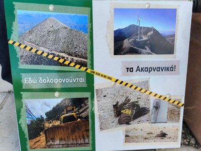 Τα μέλη της ορνιθολογικής καταγγέλλουν ότι ένα ειδεχθές περιβαλλοντικό έγκλημα εξελίσσεται αυτή τη στιγμή στα Ακαρνανικά 'Ορη: 16 ανεμογεννήτριες με ισχύ 4,8 ΜW η καθεμία (συνολικό ύψος 150 μέτρα, διάμετρος φτερωτής 133 μέτρα) είναι προ των πυλών της εγκατάστασής τους, διεσπαρμένες σε όλον τον ορεινό όγκο των Ακαρνανικών!
