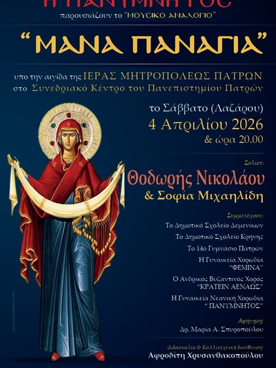 Το Μουσικό Αναλόγιο "Μάνα Παναγία" θα παρουσιάσει η Πατρινή Χορωδία «Η Πανύμνητος» το Σάββατο του Λαζάρου 4 Απριλίου 2026 στις 20.00 στο Συνεδριακό και Πολιτιστικό κέντρο του Πανεπιστημίου Πατρών στο Ρίο.