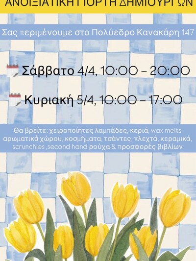 Ανοιξιάτικη Γιορτή Δημιουργών στο Πολύεδρο το Σάββατο 4 Απριλίου, 10 το πρωί με 8 το βράδυ και την Κυριακή 5 Απριλίου, 10 το πρωί με 5 το απόγευμα.