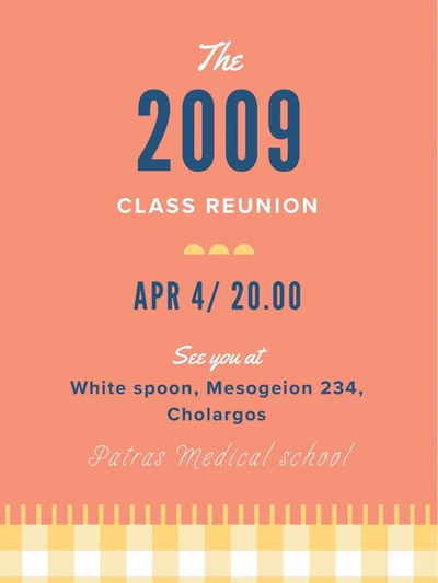 Reunion των Αποφοίτων Ιατρικής του Πανεπιστημίου Πατρών (Τάξη 2009) έχει προγραμματιστεί να γίνει το Σάββατο 4.4.2026, στις 20:00 στην Αθήνα.