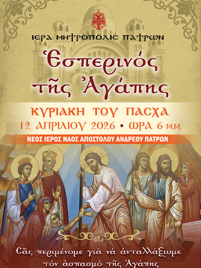 Απόγευμα, 6 μ.μ. Εσπερινός της Αγάπης στο Νέο Ι. Ν. Αγ. Ανδρέου Πατρών, προεξάρχοντος του σεβασμιοτάτου Μητροπολίτου Πατρών κ.κ. Χρυσοστόμου.