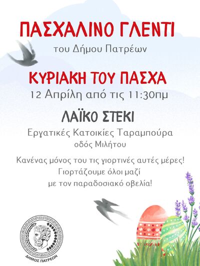 Πασχαλινό λαϊκό γλέντι ετοιμάζει ο Δήμος Πατρέων, την Κυριακή του Πάσχα, 12 Απρίλη 2026, στο Λαϊκό Στέκι στις Εργατικές Κατοικίες Ταραμπούρα στα Ζαρουχλέικα (οδός Μιλήτου 5), από τις 11.30 το πρωί.