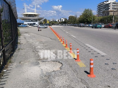 Κίτρινη διαγράμμιση και κορύνες έκαναν την εμφάνισή τους στον ποδηλατόδρομο στην Πάτρα στο ύψος του επιβατικού σταθμού Παναγιώτης Κανελλόπουλος και των γραμμών του τρένου, στη Νόρμαν.