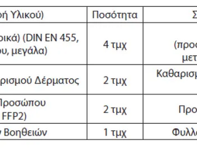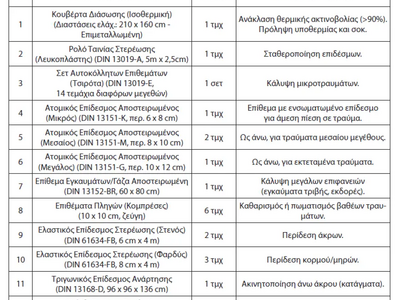 Ανάμεσά τους περιλαμβάνονται κουβέρτα διάσωσης ισοθερμική με συγκεκριμένες διαστάσεις, λευκοπλάστης, τραυμοπλαστ, επιδέσμους, επιθέμα εγκαυμάτων και πληγών, ψαλίδι πρώτων βοηθειών, γάντια μιας χρήσης, υγρά μαντιλάκια καθαρισμού δέρματος, ιατρική μάσκα προσώπου και οδηγίες πρώτων βοηθειών.