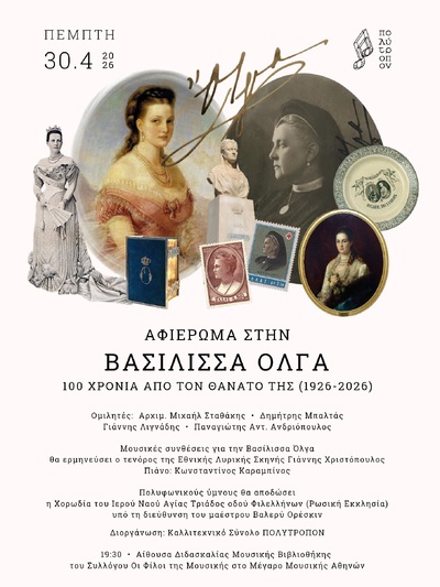 Το Καλλιτεχνικό Σύνολο «Πολύτροπον» (με υπεύθυνο τον Πατρινής καταγωγής μουσικολόγο, ιεροψάλτη και καθηγητή θεολόγο Παναγιώτη Αντ. Ανδριόπουλο), θα παρουσιάσει ένα αφιέρωμα στην Βασίλισσα των Ελλήνων Όλγα, με αφορμή την επέτειο των 100 χρόνων από τον θάνατό της, την Πέμπτη 30 Απριλίου 2026, στις 7.30 μ.μ. στην Αίθουσα Διδασκαλίας της Μουσικής Βιβλιοθήκης του Συλλόγου Οι Φίλοι της Μουσικής, στο Μέγαρο Μουσικής Αθηνών.