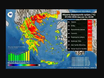 Στον παρακάτω χάρτη παρουσιάζονται οι μέγιστες θερμοκρασίες στη χώρα μας έως τις 16:40 της Μ. Τρίτης 07 Απριλίου 2026, ενώ στον πίνακα παρουσίαζονται οι 8 υψηλότερες μέγιστες θερμοκρασίες.