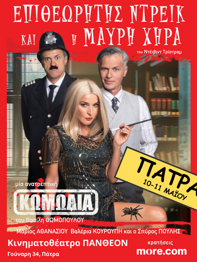 2ος χρόνος επιτυχίας για την αγαπημένη κωμωδία "Ο Επιθεωρητής Ντρέικ και η Μαύρη Χήρα" που έγινε συνήθεια & επιστρέφει στην Πάτρα για 2 μόνο παραστάσεις στο κινηματοθέατρο Πάνθεον στη Δημ. Γούναρη & Κανακάρη.