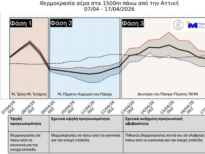 Όπως αναφέρει το meteo.gr η εξέλιξη της θερμοκρασίας στη χώρα μας τις επόμενες ημέρες μπορεί να περιγραφεί σε τρεις προγνωστικές φάσεις, με αρχικά θερμές για την εποχή συνθήκες, θα ακολουθήσει αισθητή πτώση της θερμοκρασίας σε κάτω από τα κανονικά επίπεδα και στη συνέχεια νέα άνοδος. Στο γράφημα, με βάση την ανάλυση πολλαπλών προγνωστικών σεναρίων από τα μεγαλύτερα παγκόσμια μετεωρολογικά κέντρα (100 σενάρια στο σύνολο) για τη θερμοκρασία σε υψόμετρο 1500 μέτρων ενδεικτικά πάνω από την Αττική για το διάστημα 07-17 Απριλίου 2026, αναμένουμε:
