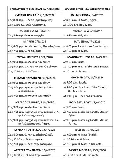 Τη Μεγάλη Παρασκευή στον Καθολικό Ναό της Πάτρας στις 7 το απόγευμα ξεκινά η Ακολουθία ενώ η περιφορά του Επιταφίου γίνεται εντός του ναού.