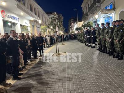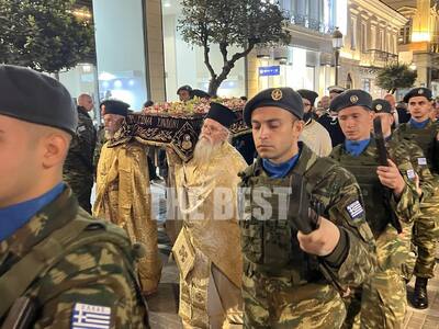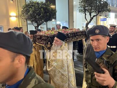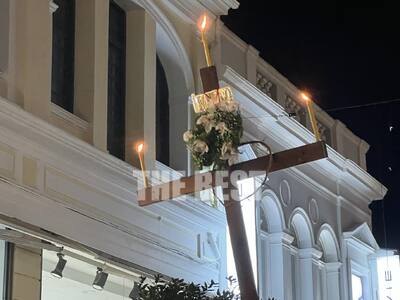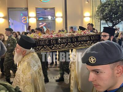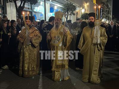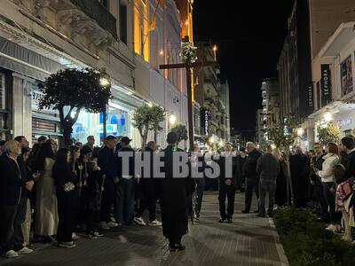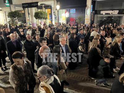 Στη συνέχεια, η καθιερωμένη περιφορά του Επιταφίου κινήθηκε στους κεντρικούς δρόμους της πόλης, με τους πιστούς να ακολουθούν με αναμμένες λαμπάδες, σε μία από τις πιο συγκινητικές στιγμές της Μεγάλης Εβδομάδας για την Πάτρα.