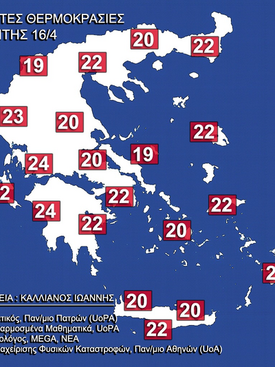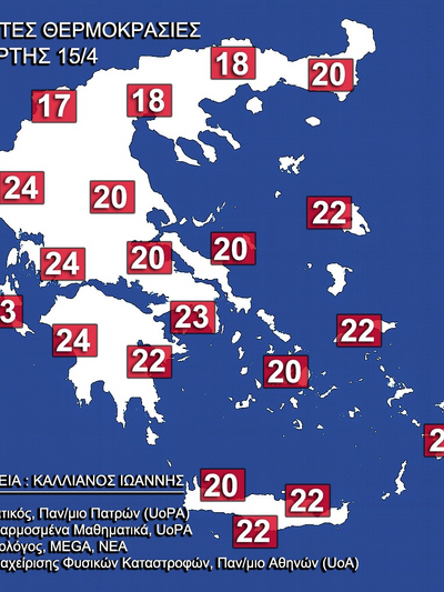 Η θερμοκρασία δεν θα σημειώσει αξιόλογη μεταβολή και θα φτάσει στα βόρεια τους 19 με 20 και τοπικά τους 21 βαθμούς, στα δυτικά τους 24 με 25 και στις υπόλοιπες περιοχές τους 21 με 23 και τοπικά στην Κρήτη τους 24 βαθμούς Κελσίου.