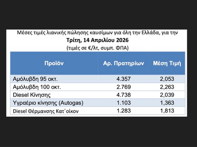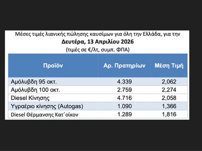 Αυτές ήταν οι μέσες τιμές πανελλαδικά τη Δευτέρα 13.4.2026. Χθες, Τρίτη, παρατηρήθηκε οριακή περαιτέρω υποχώρηση στα 2,053 ευρώ και 2,039 ευρώ το λίτρο για αμόλυβδη και πετρέλαιο κίνησης αντίστοιχα.