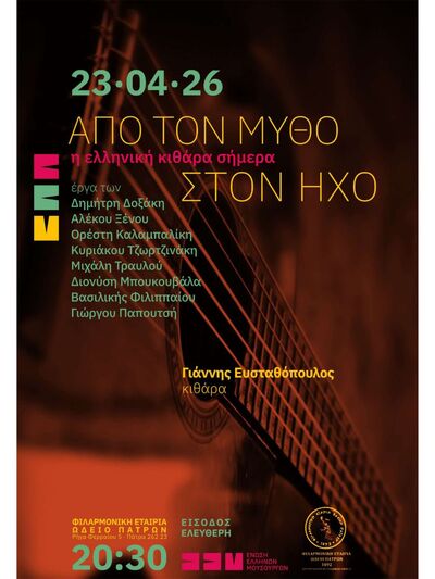 Διοργανώνει η Ένωση Ελλήνων Μουσουργών σε συνεργασία με τη Φιλαρμονική Εταιρία Ωδείο Πατρών την Πέμπτη 23 Απριλίου 2026 με τον Γιάννη Ευσταθόπουλο στην κιθάρα