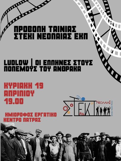 Την Κυριακή 19 Απρίλη στις 19:00, στον ημιώροφο του ΕΚΠ θα προβληθεί το ντοκιμαντέρ «Ludlow, οι Έλληνες στους Πολέμους του Άνθρακα» του Λεωνίδα Βαρδαρού