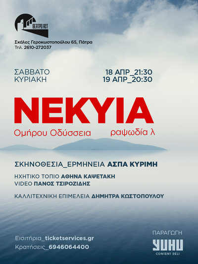 Η θεατρική παράσταση «Νέκυια Λ’ ραψωδία» - Ομήρου Οδύσσεια θα παρουσιαστεί στο Θέατρο act στις Σκάλες Γεροκωστοπούλου 65 (πάνω μέρος), στην Πάτρα το σαββατοκύριακο 18 και 19 Απριλίου 2026.