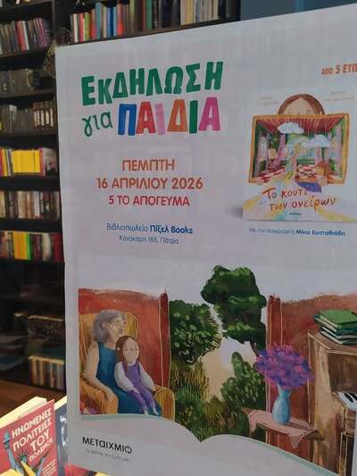 Την Πέμπτη 16 Απριλίου 2026 στις 5 το απόγευμα στο βιβλιοπωλείο Πίξελbooks στην οδό Κανακάρη 185, στην Πάτρα είναι προγραμματισμένη μία εκδήλωση για τα παιδιά, όπου θα παρουσιαστεί το βραβευμένο παιδικό βιβλίο του Μίνου Ευσταθιάδη, με τίτλο "Το Κουτί των Ονείρων" (εκδόσεις Μεταίχμιο).