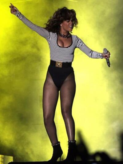 Με ένα δικτυωτό καλσόν, ένα κορμάκι και μια μπλούζα από πάνω αναδεικνύοντας το καλλίγραμμο σώμα της η Rihanna ξεσήκωσε το κοινό με την εμφάνισή της και τις χορευτικές της ικανότητες.