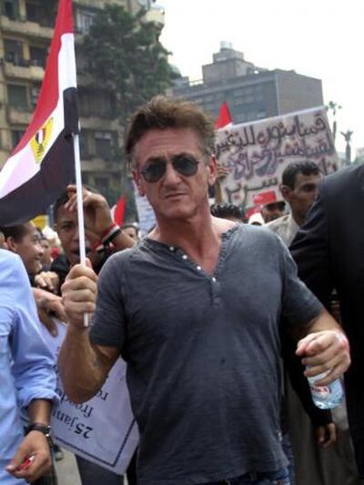 Ο Αμερικανός ηθοποιός, Σον Πεν, κρατά μια Αιγυπτιακή εθνική σημαία στην Πλατεία Ταχρίρ, επίκεντρο της εξέγερσης που εκτόπισε τον Πρόεδρο Χόσνι Μουμπάρακ, στο Κάιρο στην Αίγυπτο. Το πλακάτ στα δεξιά, στα Αραβικά, λέει: «κάναμε την επανάσταση για να αλλάξουμε, αλλά βρήκαμε τον αρχιστράτηγο να κοιμάται στο κρεβάτι».