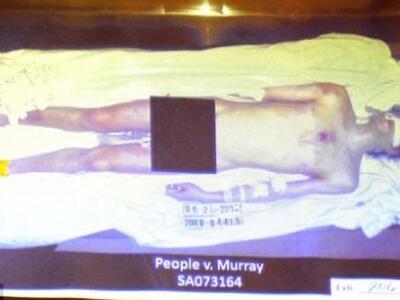 Μια καινούργια φωτογραφία που δείχνει το πτώμα του Michael Jackson παρουσιάστηκε στο δικαστήριο. Στην φωτογραφία αποκαλύπτεται το ολόγυμνο λεπτό σώμα του Jackson, λίγη ώρα μετά τον θάνατό του. Με μαύρο έχουν καλύψει τα γεννητικά του όργανα ενώ είναι ολοφάνερο το αδύνατο και ταλαιπωρημένο κορμί του τραγουδιστή.