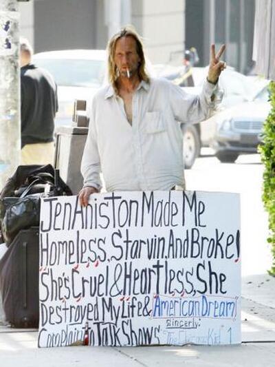 Ένας άστεγος άνδρας στο Χόλιγουντ στέκεται με μία πινακίδα σε πεζοδρόμιο και ισχυρίζεται ότι η ηθοποιός Jennifer Aniston είναι η αιτία που βρίσκεται στο δρόμο.
