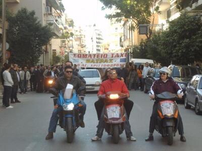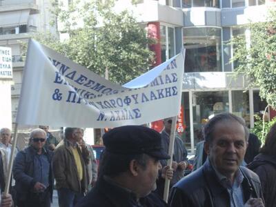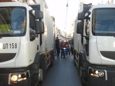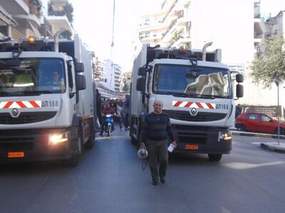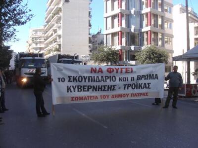 Στην κεφαλή της πορείας μπήκε το Σωματείο των εργαζομένων στην Καθαριότητα της Πάτρας, με δυο απορριμματοφόρα, ενώ στο τέλος μπήκαν οι επαγγελματοβιοτέχνες και οι έμποροι, οι οποίοι είχαν προσυγκεντρωθεί νωρίτερα στο πάνω μέρος της πλατείας Γεωργίου.