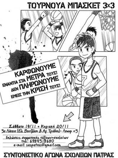Το Συντονιστικό Αγώνα Σχολείων Πάτρας διοργανώνει τουρνουά μπάσκετ με σύνθημα "Καρφώνουμε ενάντια στα μέτρα τους, δεν πληρώνουμε εμείς την κρίση τους" στις 19-20/11 στο 3ο Λύκειο (Ελ. Βενιζέλου και Αγ. Τριάδος, συγκοινωνία με το λεωφορείο Ν. 3). Για περισσότερες πληροφορίες καλέστε στο τηλ. 6984318680 και στο e-mail: [email protected]