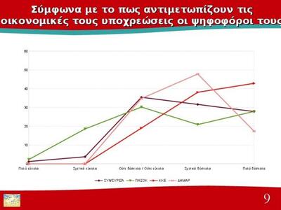 Η εικόνα που δίνουν οι ψηφοφόροι των κομμάτων σχετικά με τις απαντήσεις τους στο ερώτημα «Πως αντιμετωπίζετε τις οικονομικές σας υποχρεώσεις» σε σύγκριση με την εικόνα των εισοδημάτων είναι ανάλογη εκτός από την περίπτωση των ψηφοφόρων της ΧΑ. Στα γραφήματα στις διαφάνειες 8 και 9 εμφανίζονται τα ποσοστά των απαντήσεων στην ερώτηση «Πως αντιμετωπίζετε τις οικονομικές σας υποχρεώσεις» ανά κόμμα.