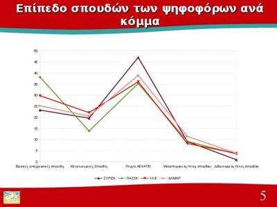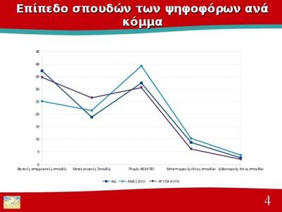 Στις διαφάνειες 4 και 5 εμφανίζεται η κατανομή των ψηφοφόρων των κομμάτων σύμφωνα με το επίπεδο σπουδών τους.