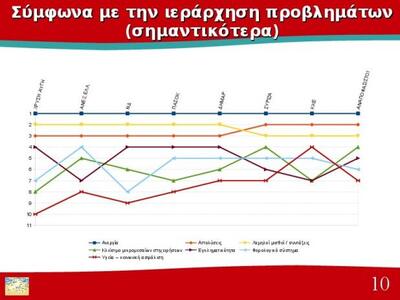 Στις διαφάνειες 10 και 11 εμφανίζεται η ιεράρχηση των προβλημάτων ομαδοποιημένη ανά κόμμα. Για να μπορέσει να ερμηνευτεί η τάση των αναποφάσιστων έχει προστεθεί και η ιεράρχηση των προβλημάτων όπως προέκυπτε από τη δήλωση όσων δεν είχαν αποφασίσει για το τι θα ψηφίσουν.