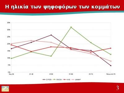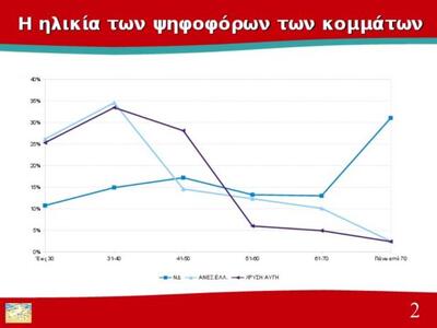 Στις διαφάνειες 2 και 3 εμφανίζονται τα ποσοστά των ψηφοφόρων των κομμάτων σύμφωνα με την ηλικία.