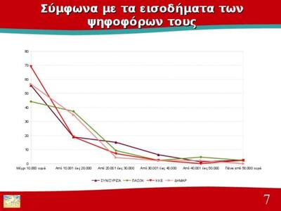 Από τη διαφάνεια 7, με αντίστοιχους υπολογισμούς προκύπτει, ότι το μέσο ετήσιο εισόδημα των ψηφοφόρων του ΠΑΣΟΚ είναι 13.500 (14.300) ευρώ, του ΣΥΡΙΖΑ 12.700 (13.900) ευρώ, της ΔΗΜΑΡ 10.900 (12.700) και του ΚΚΕ 9.300 (12.200) ευρώ.