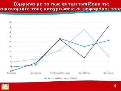 Έτσι, στη διαφάνεια 8 οι ψηφοφόροι της ΧΑ εμφανίζουν αρνητικότερες απαντήσεις από ότι οι ψηφοφόροι της ΝΔ και οι ψηφοφόροι των Ανεξάρτητων Ελλήνων θετική μετατόπιση.
