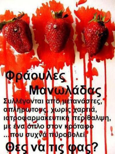 Το θλιβερό συμβάν στην περιοχή της Μανολάδας (πολλοστή φορά που συμβαίνει κάτι παρόμοιο) ξεσήκωσε θύελλα διαδικτυακών αντιδράσεων, με κύριο αίτημα το μποϊκοτάζ στις «αιματοβαμμένες φράουλες Μανoλάδας», όπως αναφέρεται χαρακτηριστικά σε πολλά status στο facebook και στο twiitter. Δείτε μερικές από τις σχετικές φωτογραφίες που κυκλοφόρησαν στο διαδίκτυο.