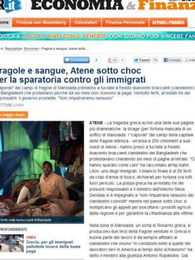 «Φράουλες και αίμα. Η Αθήνα είναι σε κατάσταση σοκ από τους πυροβολισμούς κατά των μεταναστών» είναι ο τίτλος του ρεπορτάζ της μεγαλύτερης σε κυκλοφορία ιταλικής εφημερίδας, La Repubblica, για τους πιστολέρο – επιστάτες που άνοιξαν πυρ κατά των μεταναστών – εργατών γης στη Μανωλάδα Ηλείας.