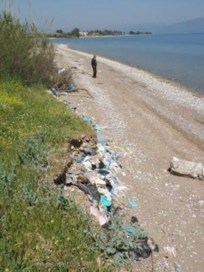 Η ορμή της θάλασσας αποκάλυψε την άκρη του σκουπιδότοπου και σκόρπισε σκουπίδια στην παραλία προς Βαλιμίτικα.