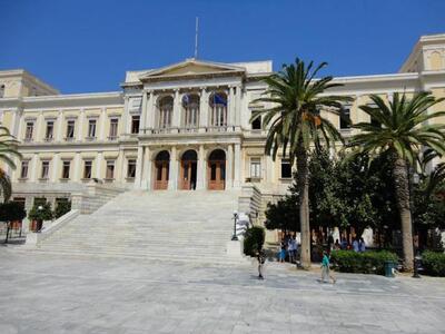 Η αποστολή εντυπωσιάστηκε από το Δημαρχείο της Ερμούπολης, έργο Τσίλλερ, όπου και έτυχε μιας πολύ θερμής υποδοχής από τον Αντιδήμαρχο κ. Δημήτρη Ρούσσο, ο οποίος υποδέχτηκε τους Πατρινούς εκ μέρους του Δημάρχου Σύρου κ. Γιάννη Δεκαβάλλα, τους συνεχάρη για την πρωτοβουλία και την εκδήλωση και τους τίμησε σε μία σεμνή τελετή με συμβολικά δώρα από το Δήμο Σύρου.