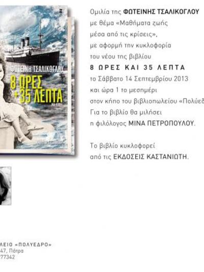 Με αφορμή την κυκλοφορία του καινούριου βιβλίου της «8 ώρες και 35 λεπτά» από τις εκδόσεις Καστανιώτη, η κυρία Τσαλίκογλου που έχει ξαναφιλοξενηθεί παλαιότερα στο Πολύεδρο του Κωστή Καπέλα και της Όλγας Νικολοπούλου, θα δώσει μια ομιλία με θέμα "Μαθήματα ζωής μέσα από την κρίση". Για το βιβλίο θα μιλήσει η φιλόλογος Μίνα Πετροπούλου.