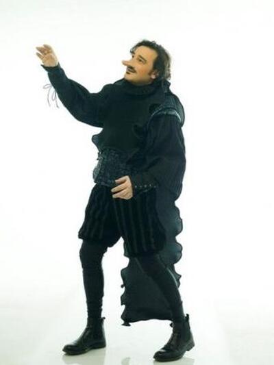 Ο Βασίλης Χαραλαμπόπουλος ενσαρκώνει τον εκκεντρικό ήρωα με τη διάσημη μύτη και την πολυσχιδή προσωπικότητα, έναν ξεχωριστό, πολυτάλαντο άνθρωπο, τρυφερό, αστείο, ποιητή και δεινό ξιφομάχο και κατ' εξοχήν τραγικό πρόσωπο, που θα παραδεχτεί τον μεγάλο του έρωτα για την εξαδέλφη του Ρωξάνη μόνο λίγο προτού ξεψυχήσει. Η Σμαράγδα Καρύδη είναι η ωραία Ρωξάνη που αιχμαλωτίζει το ατίθασο πνεύμα του Συρανό, αλλά ερωτεύεται με τη βοήθεια των στίχων του, τον νεαρό Κριστιάν, ερμηνευμένο από τον Όμηρο Πουλάκη. Πλάι τους ο Νίκος Αρβανίτης ως κόμης Ντε Γκις και πλήθος ηθοποιών και χορευτών.