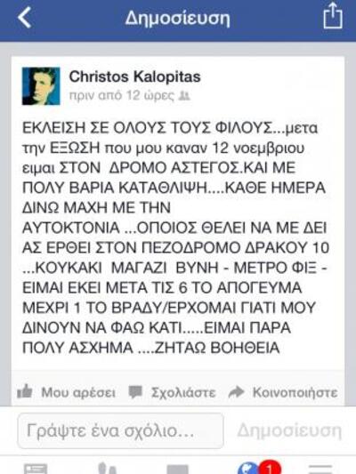 Ο Χρήστος Καλοπήτας με ένα δραματικό μήνυμα στο facebook ζητά βοήθεια. Δηλώνει πως βρίσκεται σε απόγνωση και "φλερτάρει" μμε την αυτοκτονία.Πάσχει από κατάθλιψη και δίνει το στίγμα του στον πεζόδρομο Δράκου 10 στο Κουκάκι από τις 6 το απόγευμα έως τη 1τα ξημερώματα. Εκεί όπου του δίνουν κάτιο να φάει, όπως δραματικά γράφει