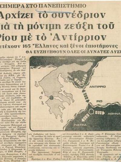 Στις 5-7 Σεπτεμβρίου 1977 ένα σημαντικό γεγονός πραγματοποιείται στην Πάτρα. Το Πανεπιστήμιο της πόλης αποφασίζει να συνομιλήσει δυναμικά με τη μεγάλη πρόκληση όχι μόνο της περιοχής, αλλά και όλης της αναπτυσσόμενης χώρας. Συνεργαζόμενο με το Τμήμα Δυτικής Ελλάδας του ΤΕΕ και υπό την αιγίδα του τότε Υπουργείου Πολιτισμού & Επιστημών, διοργανώνει το πρώτο, και μάλιστα διεθνές, συνέδριο με θέμα τη ζεύξη του στενού Ρίου – Αντιρρίου! Τα προβλήματα που δημιουργούνται από το πορθμείο στην επικοινωνία, το εμπόριο και συνεπώς στην ανάπτυξη της χώρας είναι σοβαρά και ορατά και το Πανεπιστήμιο της περιοχής επιθυμεί «…να συμβάλη εις την λύσιν του ανωτέρου προβλήματος συγκαλώντας ειδικόν συνέδριον διεθνούς και οπωσδήποτε ακαδημαϊκού χαρακτήρος».