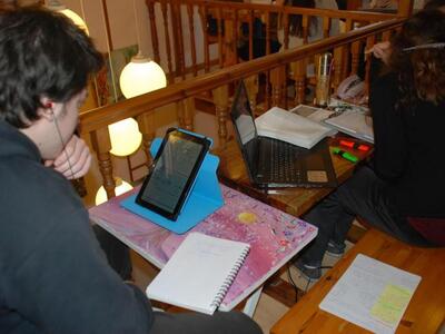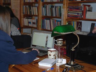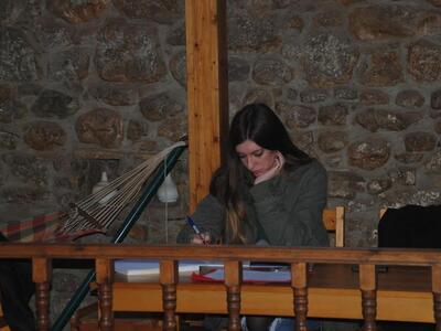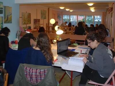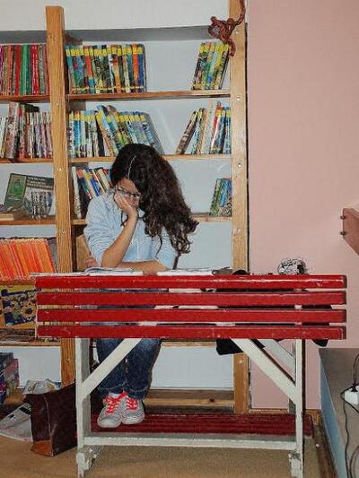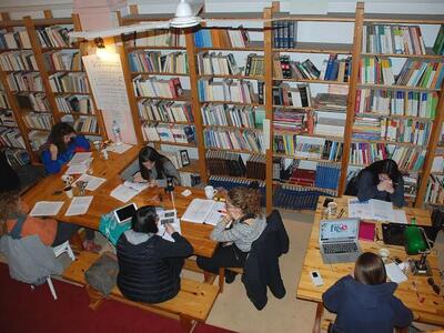 "Είναι ένα ελάχιστο τέλος αυτά τα δύο ευρώ, καθώς είμαστε η μόνη ιδιωτική βιβλιοθήκη, δεν έχουμε επιχορήγηση από κάπου. Είναι ας πούμε ένα τέλος αναγνωστηρίου. Είναι αυτπο που κάνουμε ένα.. πάρτυ διαβάσματος, καθώς αν δείτε το κόστος της συντήρησης θα καταλάβετε ότι επουδενί δεν πρόκειται περί βιοπορισμού. Θα σας πώ μόνο ότι ο καθαρισμός των χαλιών κοστίζει 6.000 ευρώ. Κάνουμε όλοι, όλες τις δουλειές. Εγώ καθαρίζω, κάνω παραγγελίες, σερβίρω, βοηθάω και τους φοιτητές της αρχιτεκτονικής" μου λέει η κ. Ηλέκτρα και με ξεναγεί σε έναν χώρο παραμυθένιο με πολλά επίπεδα, παλιά θρανία, με αιώρες, με κουνιστές πολυθρόνες, κομπιούτερ, δωρεάν ίντερνετ, μεγάλους πάγκους διαβάσματος για ομαδικές αναγνώσεις, επιμέρους γωνιές για περισσότερο μοναχικούς, τον οποίο έχει ακουμπήσει όπως μου λεει γελώντας "το μαγικό ραβδί της αρχιτεκτονικής" καθώς η ίδια είναι αριχτέκτονας.