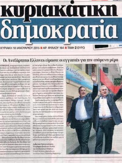 Εκτενές άρθρο του υποψήφιου Βουλευτή Αχαΐας των «Ανεξάρτητων Ελλήνων», Γιάννη Λαϊνιώτη, δημοσιεύει σήμερα η «Κυριακάτικη Δημοκρατία», συνοδεύοντας μάλιστα το ημισέλιδο δημοσίευμα της, με κοινή φωτογραφία του Αχαιού πολιτευτή, με τον πρόεδρο του κόμματος Πάνο Καμμένο.
